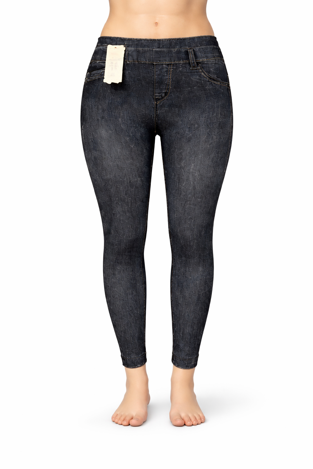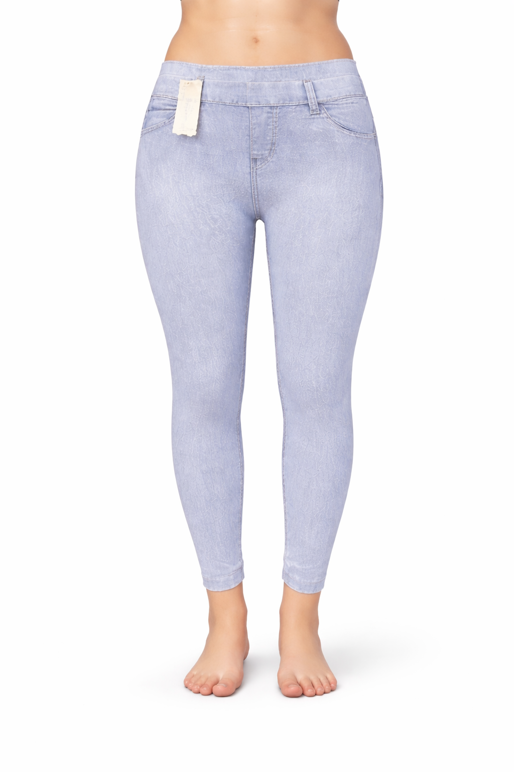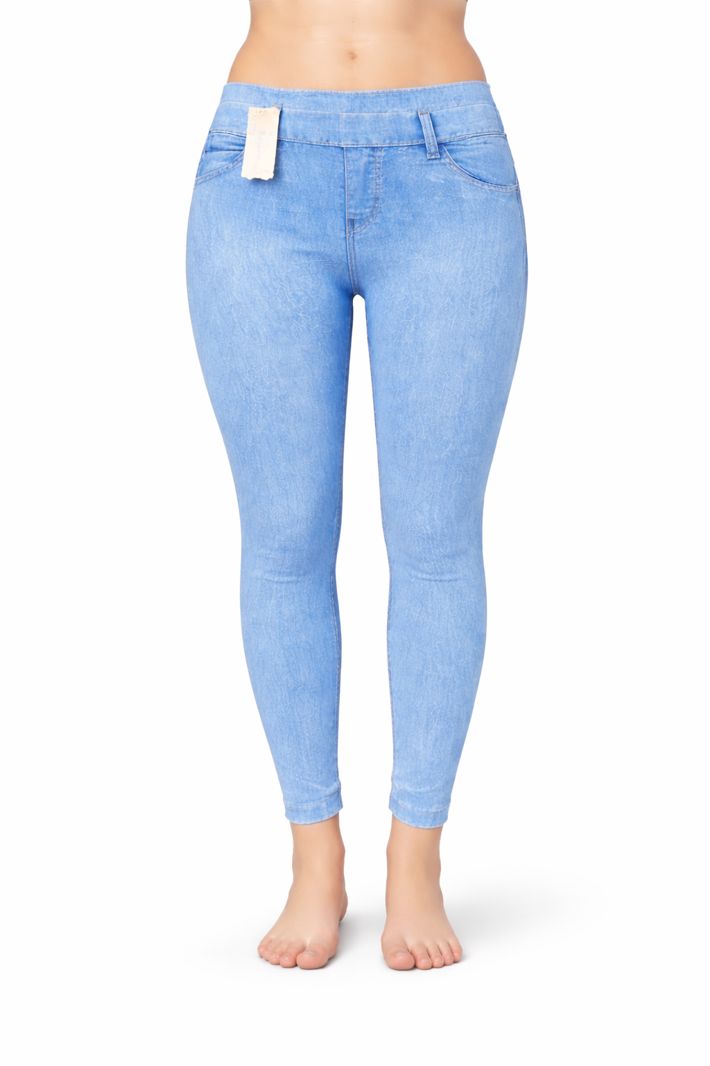 Stylish free size denim look jeggings with stretchable fabric and elastic waistband, offering a perfect slim fit and all-day comfort.