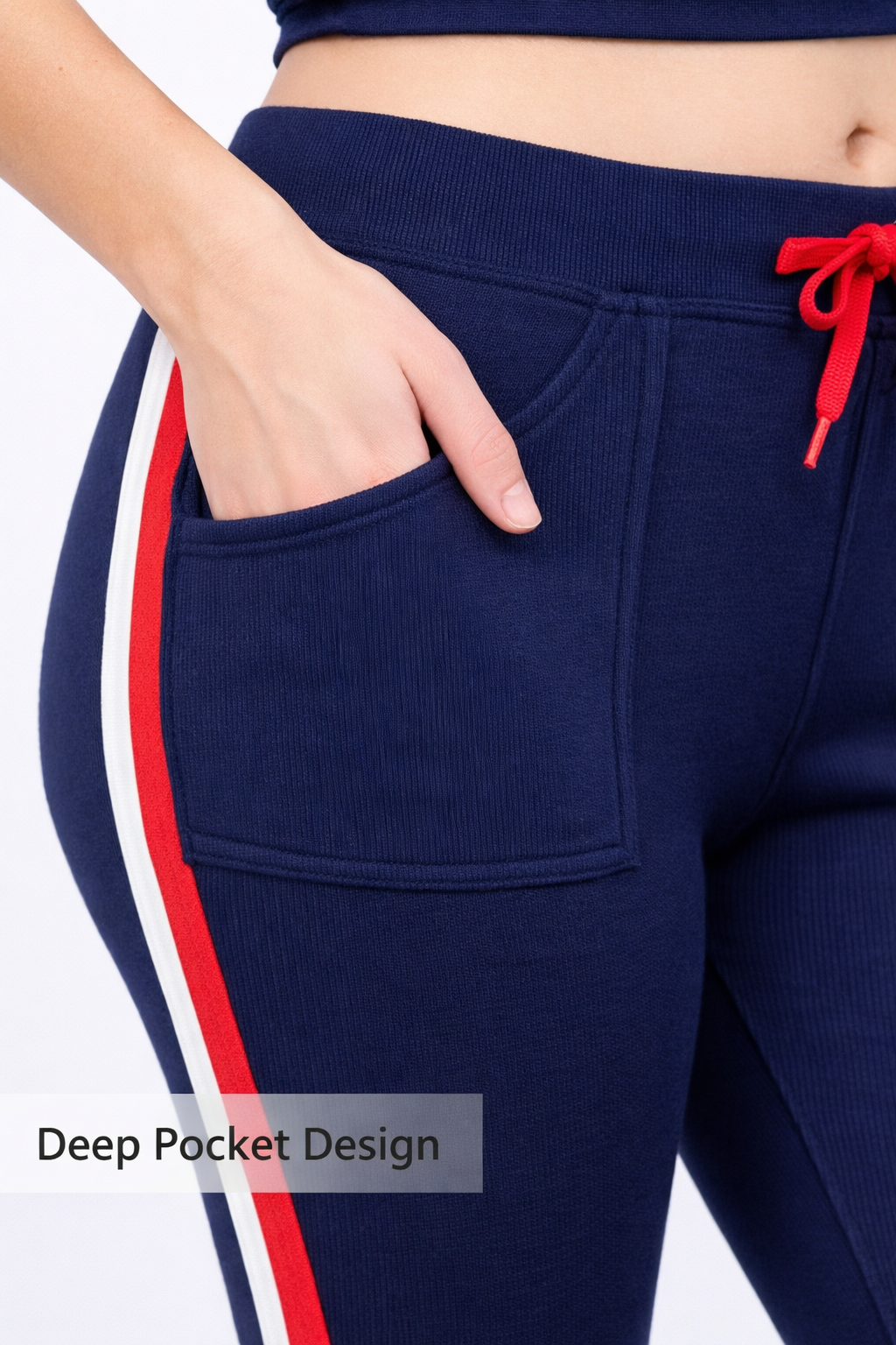 Stylish free size pocket joggers with stretchable fabric, deep pockets, side stripe design, and adjustable drawstring for a comfortable sporty look.